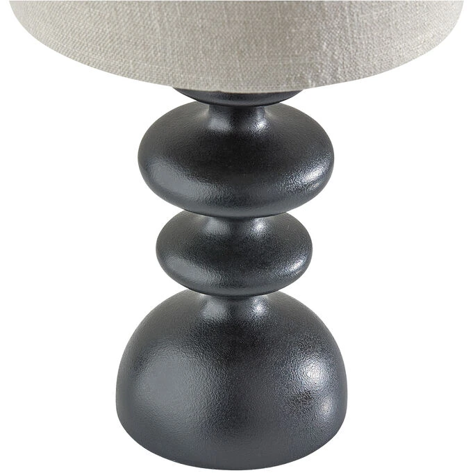 - A matte black finish is paired with a soft, taupe textured fabric shade.