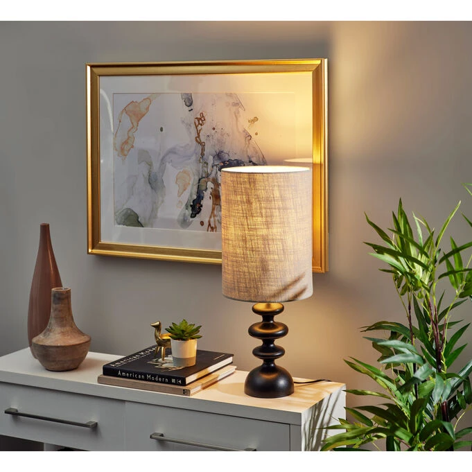 The Beatrice Table Lamp is a beautiful lamp with a contemporary style. The fabric drum shade, a distinctive stem, and black finish give this table lamp a genuinely unique look. You can quickly turn the light on or off with the rotary socket switch or connect it to a smart outlet for convenience. You can pair this Beatrice Lamp with the tall table lamp and the floor lamp for a matching, multi-tiered effect. You can find the Beatrice Table Lamp and other products from Adesso at your local Slumberland showroom. Or order yours from our website today.