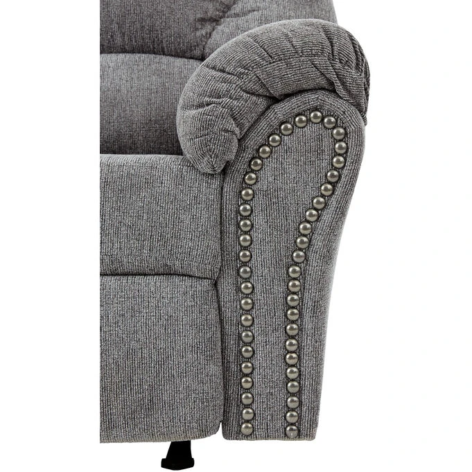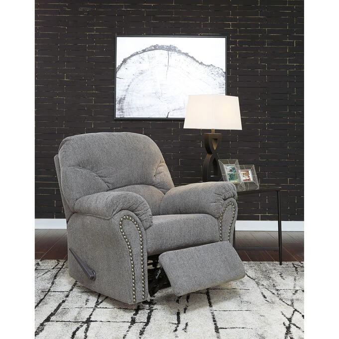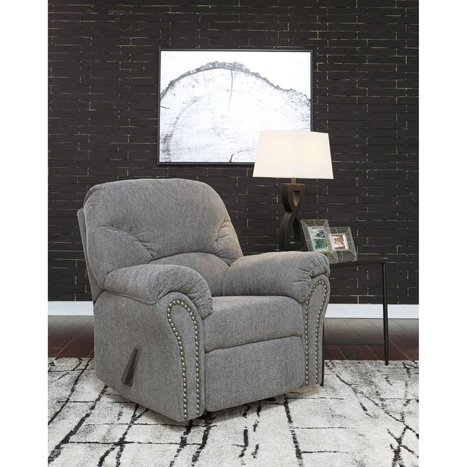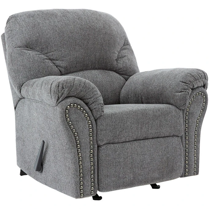 Style and comfort co-exist with the Allmaxx Rocker Recliner donned in a pewter gray/silver color. The chic divided back design and pillow-top wrapped armrests, coupled with the one-pull reclining motion, will make this your favorite chair for nodding off. And, you’ll love the way it looks, especially the black nickel nailhead trim and attached cushions.