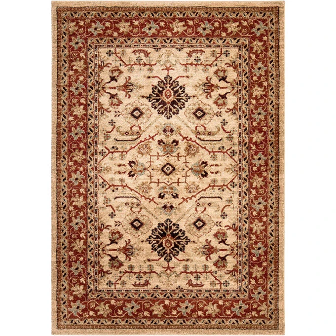 Inspired by traditional patterns and colors, the Aria Kashmir Bisque Rug features an elegant red and gold color palette, a bold floral pattern and symmetrical detailing. Available in a number of sizes, this colorful rug works well in any space and with a variety of design styles, including traditional, transitional and eclectic. This plush area rug feels as luxurious on your feet as it looks in your home. The traditional pattern is livened by rich dyes that deepen the rich colors and design. The gorgeous Aria Kashmir Bisque Rug instantly adds rich character, depth and visual interest to any space.