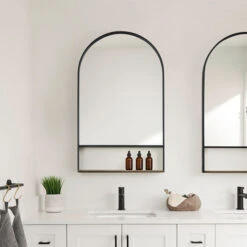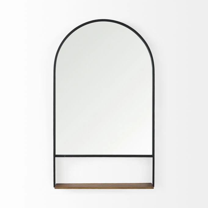 Refresh your home decor with the Cora Arched Wall Mirror, a fusion of clean design and functional elegance. Its black iron frame is defined by strong curved lines, enclosing a solid wood shelf that effortlessly blends style with utility. Ideal for both practical storage and showcasing cherished items, the Cora mirror’s sleek silhouette and wooden warmth make it an impeccable fit for modern interiors. This versatile piece creates an illusion of space and amplifies natural light, reflects captivating views, and adds texture to empty walls. The Cora Arched Wall Mirror redefines possibilities, transforming any room into a haven of sophistication and style.