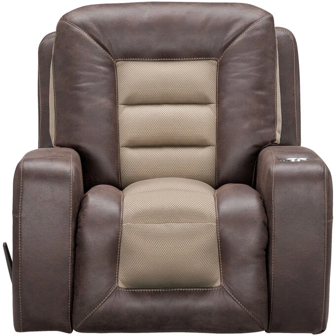 Stay comfy and keep your cool in the Malone rocker recliner. This unique recliner features breathable monofilament fiber technology to help improve air flow and keep you from overheating. This smart leather-look recliner also features a full chaise legrest for great leg support, a heavy-duty reclining mechanism, and a built-in cup holder. The Malone is a sure bet for year-round comfort and style.