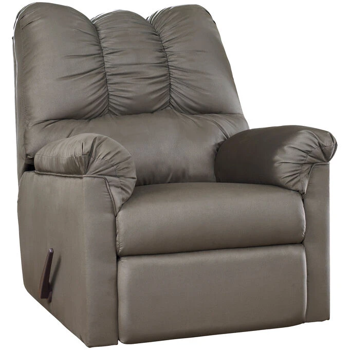 The Marcy rocker recliner is an obvious match for the rest of the Marcy collection—but its versatility goes even further. Comfort and transitional style are its strong points, with a plumply cushioned headrest and arms, one-pull reclining mechanism, and gentle rocking action. High-resiliency foam seat cushions are wrapped in thick poly fiber and covered in soft, lustrous polyester upholstery. The frame is glued, stapled and blocked at corners for durability, and the seat is reinforced in metal.