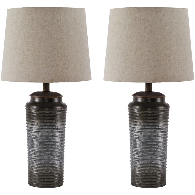 This set of 2 Norbert table lamps makes a brash statement. Made of textured galvanized metal, each lamp features a horizontal ribbed design that complements modern industrial design to country rustic. And with a 3-way switch, theyβre perfect for anything from soft ambient lighting to plentiful reading light. Topped with a fabric hardback shade. Requires 150-watt maximum bulb (25-watt CFL).