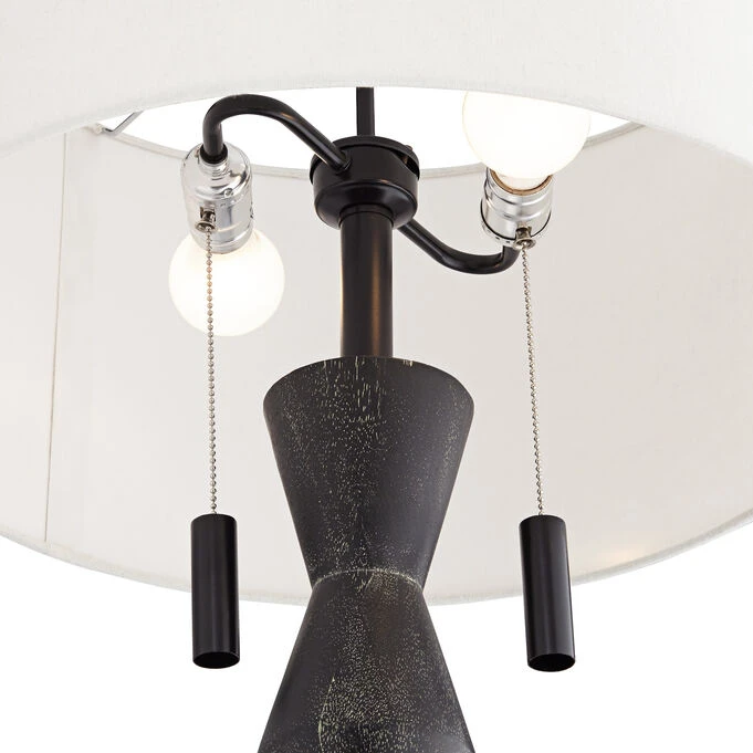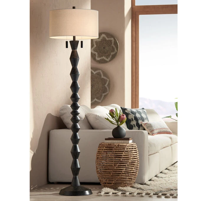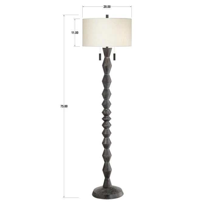 Add this tall and slender Norden Floor Lamp from Pacific Coast Lighting to your living space to bring refreshed luminescence to the room of your choice. This lighting fixture comes in both black and rust-white color options, and each is equipped with a soft white linen shade and a metal pull chain that switches the light on and off. The Norden Floor Lampβs base is made of metal and resin and features a woven geometric pattern, standing 75β tall and reaching 20β wide. This lighting fixture takes less than 15 minutes to assemble and comes equipped with a one-year warranty upon purchase. Shop the Norden Floor Lamp today or visit your nearest Slumberland location in person to see other large lamps from Pacific Coast Lighting on display.