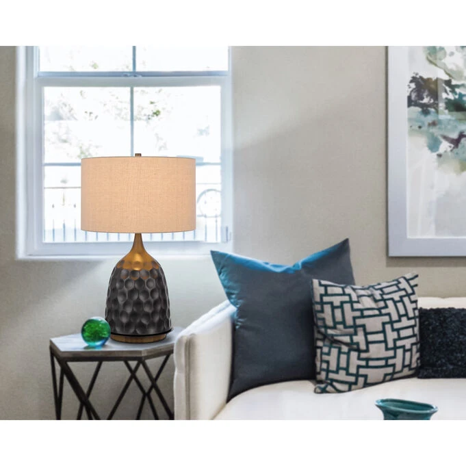 Whether used as a reading lamp in the living room or bedside, the Oskaloosa Table Lamp is more than a simple decoration. It is practical lighting that makes your day-to-day life better. This dark charcoal gray lamp is a perfect accent for contemporary, modern, transitional, eclectic or rustic style spaces. The lamp features a round hammered metal design with a contrasting wooden base. The lamp is complemented with a light tone neutral, hardbacked linen drum shade and matching finial. Practical and decorative, the Oskaloosa Table Lamp works with the rest of the lighting in the room to create the perfect ambiance.