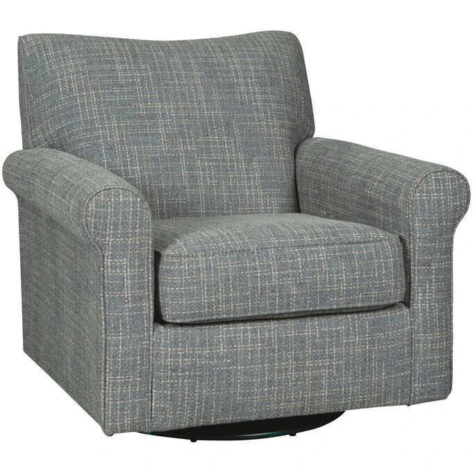 Rock your cares away in the Renley Swivel Glider Accent Chair. The tantalizing tweed weave fabric in a soothing blue hue is just the beginning, and the rolled arms provide a modern twist. Once you sit, take advantage of the smooth, 360-degree swivel base that caters to your viewing pleasure and the gentle glider feature that will help you relax and take your mind off anything.