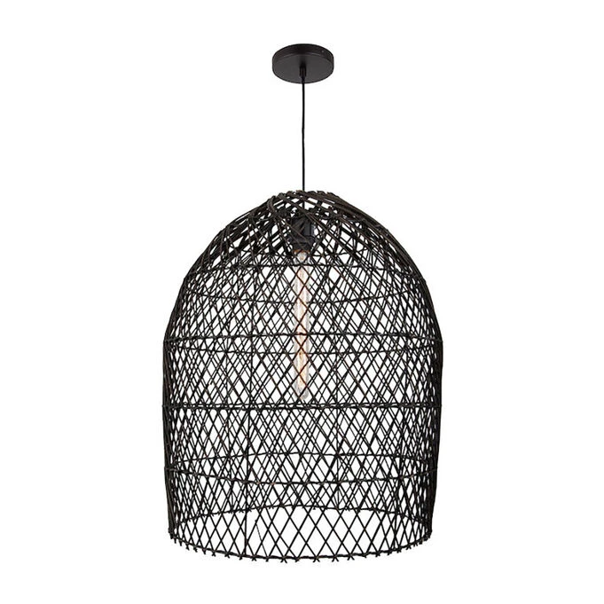 Experience the captivating design of the Tabuk Pendant Light and add a touch of casual sophistication to your interiors. This transitional pendant light features a sleek canopy and slender cable that suspend a single downward-oriented socket inside a dome-topped, cage-style shade made of natural rattan. The open-weave basket shape of the shade is adorned with slender, crisscrossing fibers that form repeating diamond shapes, softening direct brightness while casting a wide wash of downlight below the fixture. The black-painted finish adds a touch of elegance and complements any decor style. The Tabuk Pendant Light brings casual, comfortable style to your kitchen or breakfast nook.