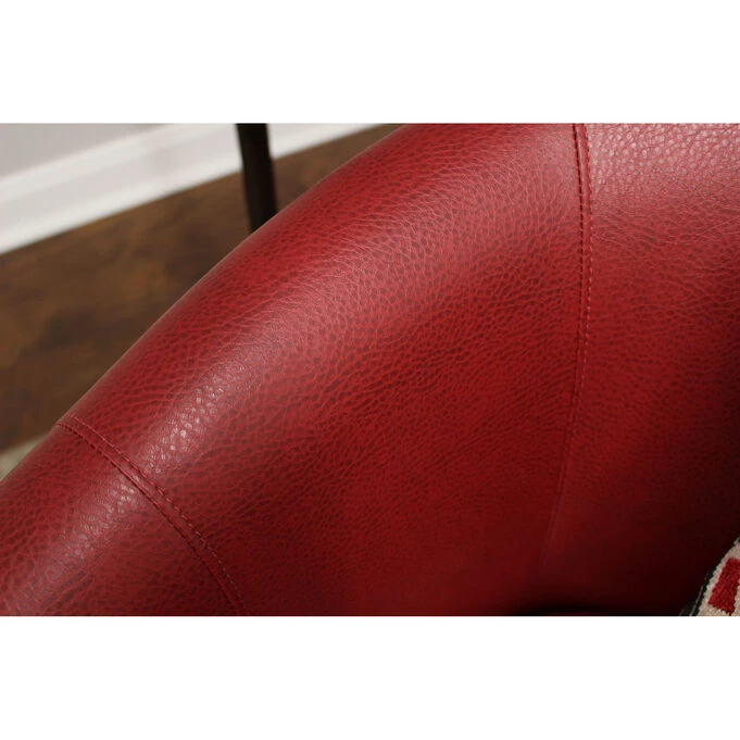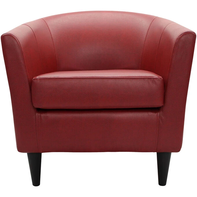 The Windsor accent chair is the perfect solution for smaller spaces. Covered in sleek, leather-look polyurethane, this barrel chair provides comfortable seating that fits right in with your contemporary or transitional living room, family room or den. This faux leather chair is sturdy yet remarkably lightweight, with a polystyrene frame thatβs even stronger than traditional wood. Tapered wood legs add a distinctive touch.